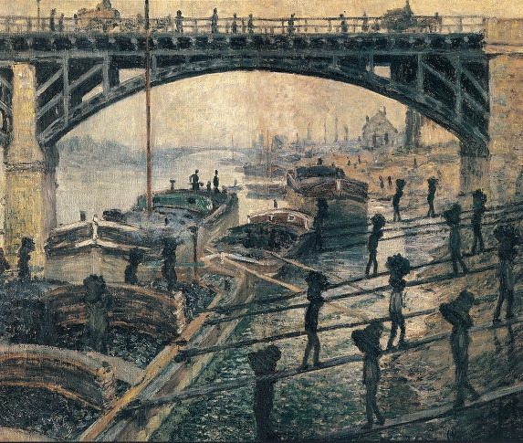 느루야, <석탄을 내리는 남자들, 1875>을 보렴. 센강에서 석탄을 지고 운반하는 남자들의 모습이야. 인상파 특유의 짧고 거친 붓질이 느껴지면서도 형식적으로는 수평, 수직, 대각선의 균형과 먼 곳이 희미해지는 원근법이 조화롭게 구성되어 있는 고전적 형식이 강한 그림이지. 이렇듯 전통을 따르는 그림임에도 불구하고 화면엔 선명하고 진보적인 어둠이 있어. 모네는 그들을 개인이 아닌 프랑스 근대 혁명이 낳은 시대의 조산아 '군중'처럼 묘사함으로써 부르주아와 프롤레타리아의 양극단으로 벌어진 사회 구조를 보여주었단다.
