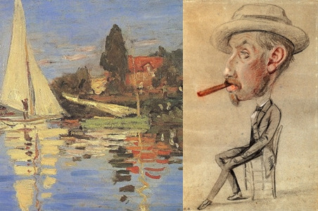 느루야, 위의 두 그림 볼래? <큰 시거를 물고 있는 남자의 캐리커처, 1855>엔 우리가 아는 모네는 없어. 오히려 관습적인 장르를 자신이 가진 재능을 살려 보다 더 유쾌하고 익살스럽게 그린 전문화가가 있을 뿐이야. 하지만 스무 해가 지난 작품인 왼쪽의 <아르장퇴유의 요트경기, 1875>를 봐. 같은 모네의 그림인데도 확연히 달라. 개성적인 그의 예술세계를 엿볼 수 있지. 빛의 산란으로 물빛에 잘게 부서지는 요트의 그림자를 붓이 바다 위를 달려가듯 그렸어. 모네가 처음 빛의 찰나를 잡아 화폭에 옮겼을 때, 고전적 어법의 그림에 익숙한 사람들은 모네의 그림을 벽지만도 못한, '그리다 만 그림'이라고 맹비난했단다.