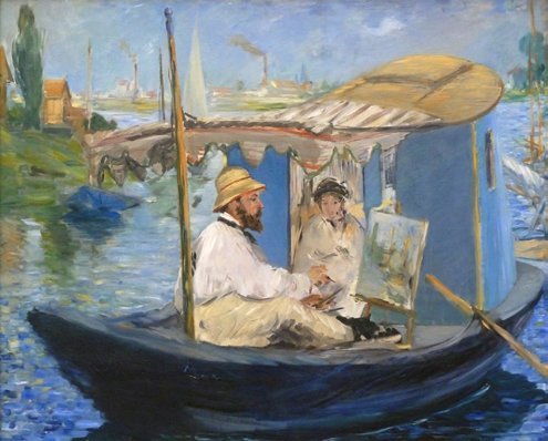 느루야, 아내를 무척 사랑했던 모네는 친구들과의 우정도 깊었단다. 그중 마네와는 형과 동생 사이처럼 가까웠다고 해. 모네가 경제적으로 어려울 때, 마네가 그의 동생에게 모네의 작품을 구입하자고 청한 편지가 남아있어. 둘은 서로의 초상화를 그려주며 즐거운 시간을 보내기도 했고 모네의 영향을 받은 마네가 1874년 <아르장퇴유>라는 작품을 남기기도 했어. 모네는 아르장퇴유에서 중고 보트를 사 센 강에 띄우고 곧잘 그 안에서 그림을 그렸다는구나. '선상 화실'이라고 해야 하나? 에드와르 마네의 <선상 화실에서 그림 그리는 끌로드 모네, 1874>라는 작품이 남아 있단다.
