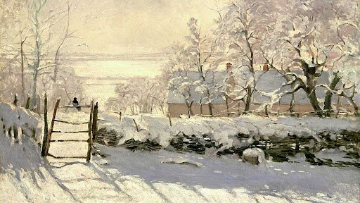 창 밖에 모네의 <까치, 1868~1869>가 "깍깍" 엄마를 부르네. 모네가 힘든 무명시절을 보내고 있던 1868년에 그린 그림 속 주인공인가? 일반적으로 '눈'은 빛의 변화나 흐름을 표현하기 어려워 인상주의 화파의 화가들은 잘 다루지 않았어. 그는 빛이 공기와 부딪쳐 진동하는 순간을 옅은 바이올렛, 그윽한 초록 등 색색의 향연으로 바꾸어 놓았지. 아무도 관심 기울이지 않았던 '미세한 빛의 각도와 양과 색깔'을 눈으로 재고, 달고, 표현해 그 근수만큼의 세상을 창조했어. 그리고 그곳에 반가운 소식을 전하는 까치를 불러들였지.