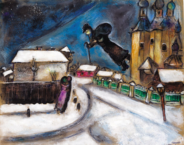 어린아이가 뭉툭한 크레파스로 그린 것 같이 담백해. 화려한 기교라고는 찾아볼 수 없어. 그림 오른쪽을 보렴. 꼭대기가 돔 모양인 러시아 정교의 교회가 있고, 아래 야트막한 건물엔 지붕이 하얗게 빛나. 화면의 아래쪽도, 다른 건물의 지붕들도 모두 흰 눈에 덮인 듯 하얗구나. 숨이 멎듯 고요해. 그 위에 지팡이를 들고 커다란 보따리를 맨 남자가 있어. 덥수룩한 수염에 모자를 쓰고 외투를 걸친 걸 보니 어디론가 떠나려나? 그의 결심은 단단해. 지팡이가 굳세게 앞으로 나와 있잖아. 그는 누구고 저 하늘을 날아 어디로 가려는 걸까?