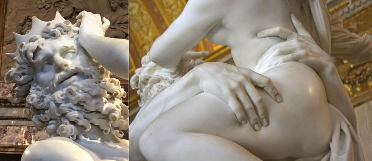 골인지점을 코 앞에 둔 달리기 선수처럼 이 시기, 베르니니의 에너지는 폭발했단다. 마치 올림푸스 산에서 일하고 있는 헤파이스토스의 손을 빌려온 듯했지. 헤파이스토스의 망치가 모루를 내리칠 때마다 신들의 무기가 쏟아졌듯, 베르니니의 끌이 닿는 곳마다 영웅과 미녀의 살과 피가 튀었어. 그는 밤새 창조의 불을 밝혔고 작업실엔 이글이글 열정이 불타 올랐어. <다비드, 1623~24>, <페르세포네의 겁탈, 1621~22>, <아폴로와 다프네, 1622~25> 등이 모두 이때의 작품들이지. 느루야, 그중 <페르세포네의 겁탈>을 보여 줄게.