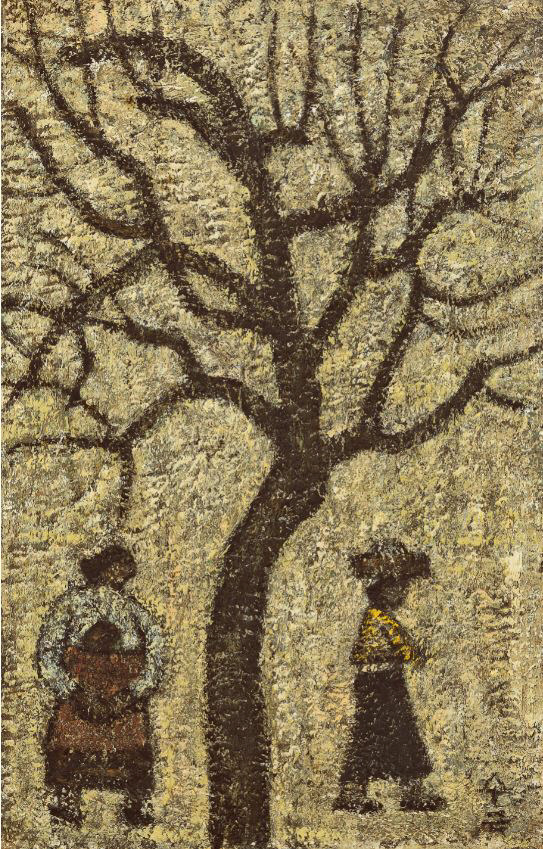 그럼 이제 봄의 향기가 애달프도록 절실한 겨울 나목을 우리의 눈으로 찬찬히 들여다볼까요? 겨울나무 한 그루가 서 있습니다. 모든 걸 떨어뜨려 가릴 것도 숨길 것도 없이 맨몸 그대로입니다. 삭풍에 온 몸을 내어 맡기고도 떨지언정 피하지는 않을 듯합니다. 그 아래엔 아기를 업은 여인과 머리 위에 짐을 이고 가는 여인이 있습니다. 두 여인 사이에는 아무런 연대도 보이지 않지만 아이를 업고, 짐을 이는 행위 자체가 이미 일상을 짊어진 여인이라는 공통점이 있습니다. 고단한 시절을 살아낸 우리의 엄마들처럼. 화면은 바위 질감을 나타내는 두꺼운 마티에르 효과로 인해 함축적인 선에 진중한 깊이가 더해졌습니다.