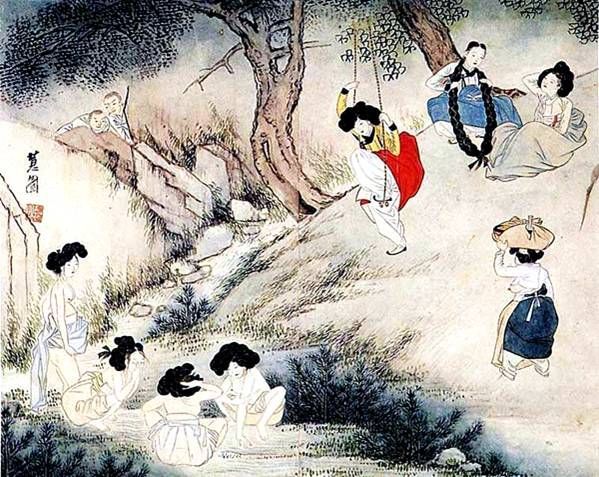 보퉁이 위로는 가채를 늘어뜨린 젊고 어린 두 여인의 멀리 가지 못하는 수다가 있습니다. 아무도 그녀들을 보고 있지 않네요. 이제 낙관을 보려는 순간, 숨어있던 그들의 반짝이는 눈이 보입니다. 호기심 가득한 얼굴과 까까머리, 여인들을 훔쳐보고 있는 두 명의 동자승입니다. 그들은 좁고 가는 어깨, 둥그런 엉덩이, 움켜쥐어보고 싶은 젖가슴을 한 몸에 가지고 있는 여인들이 신기하기만 합니다. 마치 관람자가 들여다보고 있는 듯, 동자승의 시선이 개울가의 아낙네와 그네를 오르려는 여인을 한 풍경으로 붙들고 있습니다. 역시 신윤복의 치밀한 솜씨입니다.