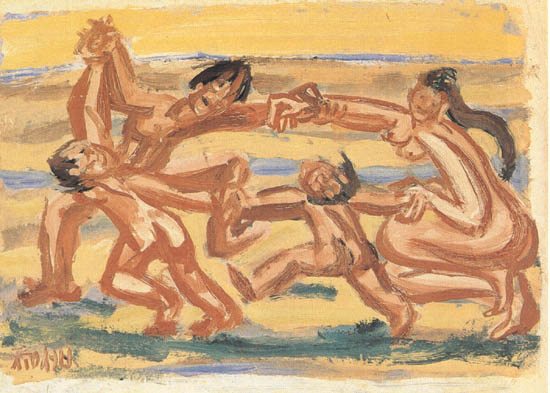 깔깔거리는 소리가 화면 밖으로 튀어나오려고 하지? 아이들이 무지 행복해 보이는걸. 춤추는 엉덩이와 다리에는 세상의 난폭함을 훌쩍 뛰어넘는 '발랄'과 '명랑'이 묻어 나오지. 들짐승과 날짐승처럼 뛰어노는 아이들의 머리는 터져 나오는 웃음의 무게를 이기지 못해 한껏 젖혀져 있어. 아이들의 발바닥은 구름을 딛고 있는 듯 너나들이 경계가 없어 보이네. 엄마와 아빠와 아이들이 맞잡은 둥근 원은 전쟁으로 오염된 세상에 대한 백신일 테지. 풍향과 풍속에 흔들리는 말을 버리고 행복한 웃음소리만 남겨 놓은 이 그림은 이중섭의 <가족>이란다.