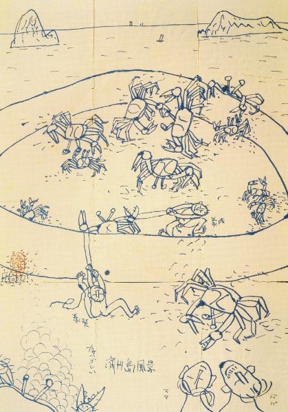 1950년 6.25 전쟁이 발발했지. 친가, 외가 모두 지주였고 아내는 일본인이었으니 해방과 동란을 겪으며 그의 삶은 끝없이 쫓겼단다. 전세(戰勢)는 갈수록 악화되어 반도 끝자락 제주도로 이주하게 되었어. 제주도 서귀포에 1.4평짜리 방을 얻었지. 그곳은 아, 그곳은 바다가 보이는 곳이었어. 바다와 잇닿은 하늘은 상처에 바르는 아까징끼처럼 붉은색이었다가 게들이 숨구멍을 내놓고 눈치 보는 갯벌처럼 검푸른 색이 엎치락뒤치락했어. 이중섭은 배고프고 눈 맑은 두 아이 태현, 태성이와 게를 잡았지. 그리고 잡아먹은 게에게 미안해 게 그림을 그렸어.