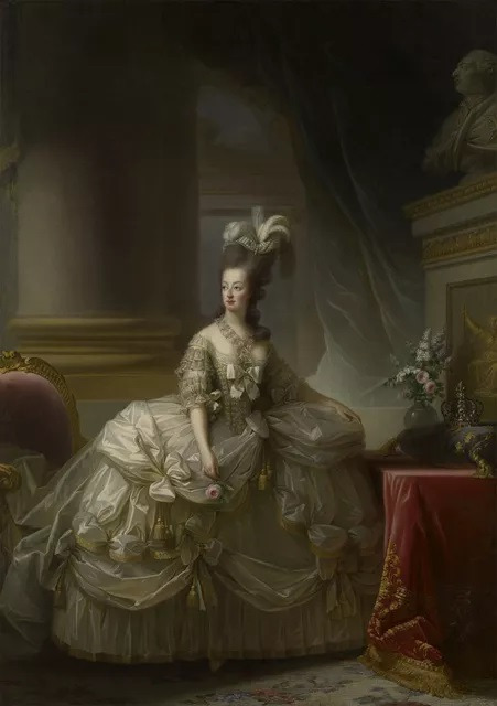 그녀는 1770년 결혼했습니다. 이 작품은 1778년이니 결혼 후 8년 째이네요. 그녀는 은빛이 도는 실크에 풍성한 주름으로 실루엣을 살리고 화사한 리본을 단 프랑스 전통 드레스를 입고 있습니다. 실크의 광택 때문인지 흰 피부가 더욱 창백하게 보입니다. 그녀의 볼은 손에 든 분홍 꽃으로 살짝 두드린 듯 발그레합니다. 머리엔 깃털이 높이 솟은 모자를 썼군요. 꼿꼿한 자세에서 어릴 적부터 몸에 밴 품위가 엿보입니다. 하지만 그녀는 드레스 아래 살짝 엿보이는 저 작은 발로 1793년 단두대에 오릅니다. 마리 앙투아네트가 이 초상화 작업을 위해 자세를 취할 때는 상상도 하지 못했겠지요?