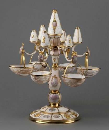 이 셔벗용 식탁 장식은 합스부르크가의 부유함을 나타내기에 부족함이 없어 보입니다. 셔벗은 지금의 우리에게는 일종의 '샤베트'입니다. 과즙에 물, 우유, 설탕, 크림 등을 넣고 아이스크림 모양으로 얼린 빙과이지요. 그걸 담는 그릇인 셈인데 각각의 조가비에 사람 얼굴을 양각한 장신구와 금장식이 둘러져 있습니다. 사람 얼굴은 모두 황실 인원입니다. 마리아 테레지아와 프란츠 1세도 있지요. 셔벗을 먹을 때 부조에 새긴 인물들이 사용했을 것이라 짐작하고 있습니다. 카를 6세의 아내인 황후 엘리자베트 크리스티네의 것이었다고 합니다. 정말 "악" 소리 나는 화려함입니다.