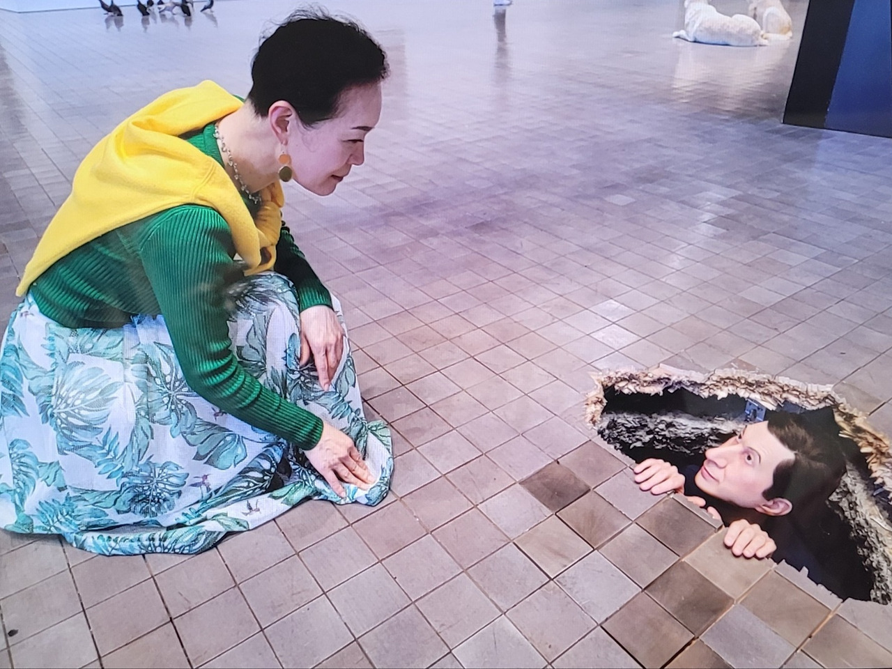 글쎄. 게으르긴 하지만 자신의 작품이니 카텔란에게 물어보면 어떨까? 요번엔 성의껏 대답을 해 줄지도 몰라. 계단을 오르기 전, 고급스러운 리움미술관 바닥을 뚫고 전시실을 엿보는 카텔란의 모습을 보았거든. 아니나 다를까. 아래층으로 내려가니 두 눈을 말똥말똥 뜨고 주위를 살피는 그가 있지 않겠니? 엄만 인증샷을 찍고 싶더라. 주위를 둘러보았어. 거의 젊은 연인들이었는데 마침 엄마 옆으로 한 청년이 지나가지 않겠니?