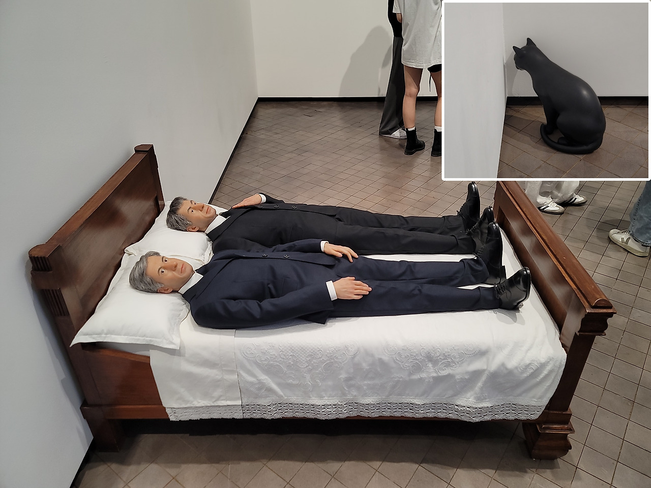 정장 차림의 두 남자가 침대에 나란히 누워있어. 얼굴을 보니 카텔란 자신이네. 그는 침대에 누워서도 옷이나 구두를 벗지 못해. 편안한 휴식은 꿈도 꾸지 못하지. 그는 잠을 자지도 못하는구나. 장소만 바뀌었지 그의 밤은 낮의 연속이야. 그는 자신을 바라보는 자신과 함께 있어. 아니면 침대에서까지 자신을 평가하는 타인과 동침하고 있어. 그가 누구든 둘은 서로 친하지 않아. 좁은 침대에서 마저 손끝하나 닿지 않게 조심하는 모습이잖아. 방 귀퉁이엔 밤을 지키는 검은 고양이의 뒷모습이 보여. 고독하네. 침대에 누워있는 카텔란과 검은 고양이 중 누가 더 외로운 걸까?