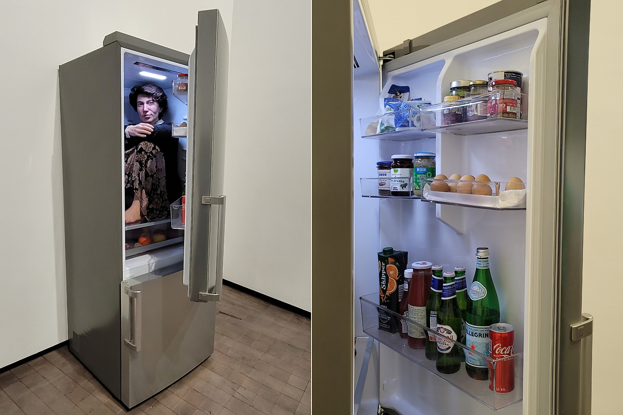 위 그림을 보렴. 돌아가신 엄마를 기린 작품이라고 해. 보기만 해도 우리의 깊은 곳을 건드리지. 아마도 카텔란의 어머니는 평생 가정을 돌보며 무지막지한 노동을 감내하셨을 거야. 냉장고에 갇혀 있는 것만 봐도 알 수 있어. 그런데 엄마를 더 아리게 했던 건 냉장고 안의 먹거리들 때문이었어. 콜라, 오렌지주스, 케첩, 달걀, 맥주, 잼, 피클... 영양소를 담기엔 너무나도 얄팍한 음식들.
