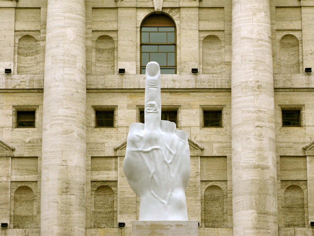밀라노시에서 의뢰받아 2011년 제작한 <L.O.V.E>라는 작품이야. 언뜻 보면 손가락 욕을 표현한 듯 하지. 완성작을 보고 황당한 밀라노 시(市)가 카텔란에게 작품에 대한 설명을 요구하자 파시스트의 경례하는 손에서 가운데 손가락을 제외한 나머지 손가락을 자른 형태라고 답했대. 사실이든 아니든 밀라노 시는 그 대답을 믿고 싶었을 거야. 이 쥘 수도 놓을 수도 없는 작품을 작가의 의도를 핑계 삼아 2차 대전 당시 파시스트 정권의 상징이었던 빨라쪼 메짜노떼(Palazzo Mezzanotte)가 있는 아파리광장(Piazza Affari)에 설치하기로 했지.