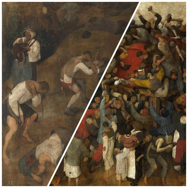 이후 서유럽은 하나님께 가는 두 갈래 길, 즉 가톨릭과 개신교 중 하나를 고집하느라 다시는 보지 않을 얼굴을 하고 유머도 없이 꾸준하고 진지하게 싸웠습니다. 길 위에는 다리 잘린 이, 팔 없는 이, 앞 못 보는 이가 사방을 헤매었고, 숲이 타는 냇내 속에 피냄새가 배어들었습니다. 붓 하나로 하나님의 말씀을 나비처럼 날게 하고, 은혜가 폭포처럼 쏟아지게 하던 화가들은 화구를 챙겨 들고 싸움터를 떠나 신흥 부자들의 거주지, 플랑드르 지방으로 향했습니다. 피터르 브뤼헐은 그 플랑드르 지역인 네덜란드에서 <성 마르틴 축일의 포도주, 1565~1568>라는 작품을 그렸습니다.