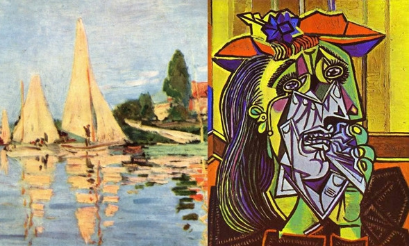 이제 피카소가 그린 <볼라르의 초상>을 보자. 아니, 이게 뭐람? 인물을 그린 건 어렴풋 알 수 있지만 나머지 형태는 깨진 유리로 사물을 본 듯 모두 조각 나 있네. 형태가 분명하지 않지? 세잔이 그러했듯이 피카소는 면과 면을 절단해 한 화면에 공평하게 배치했거든. 흔히 전시회를 가보고 무얼 그렸는지 모르겠다는 푸념의 시작이지. 관람객을 한껏 초라하게 만드는 현대미술의 시작이기도 해. 피카소는 추상미술이라는 낯선 영역으로 발을 내디뎠어. 피카소가 한 발 한 발 내 디딜 때마다, 세잔이라는 육중하고 신선한 이름의 발자국이 앞에 있었단다.