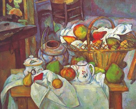 옆에 있는 하얀 주전자는 어떠니? 좀 더 낮은 곳에서 본 시점이지. 주전자 뚜껑과 항아리 주둥이의 타원형의 차이에서 같은 시점이 아니라는 걸 알 수 있을 거야. 주전자 뒤에 있는 커다란 바구니는 약간 아래에서 위를 보는 각도에서 그려진 거지. 그런데 바구니 안에 담긴 과일은 위에서 내려다본 시점이야. 테이블 위에 놓인 과일들도 제각각의 방향을 가지고 있어.