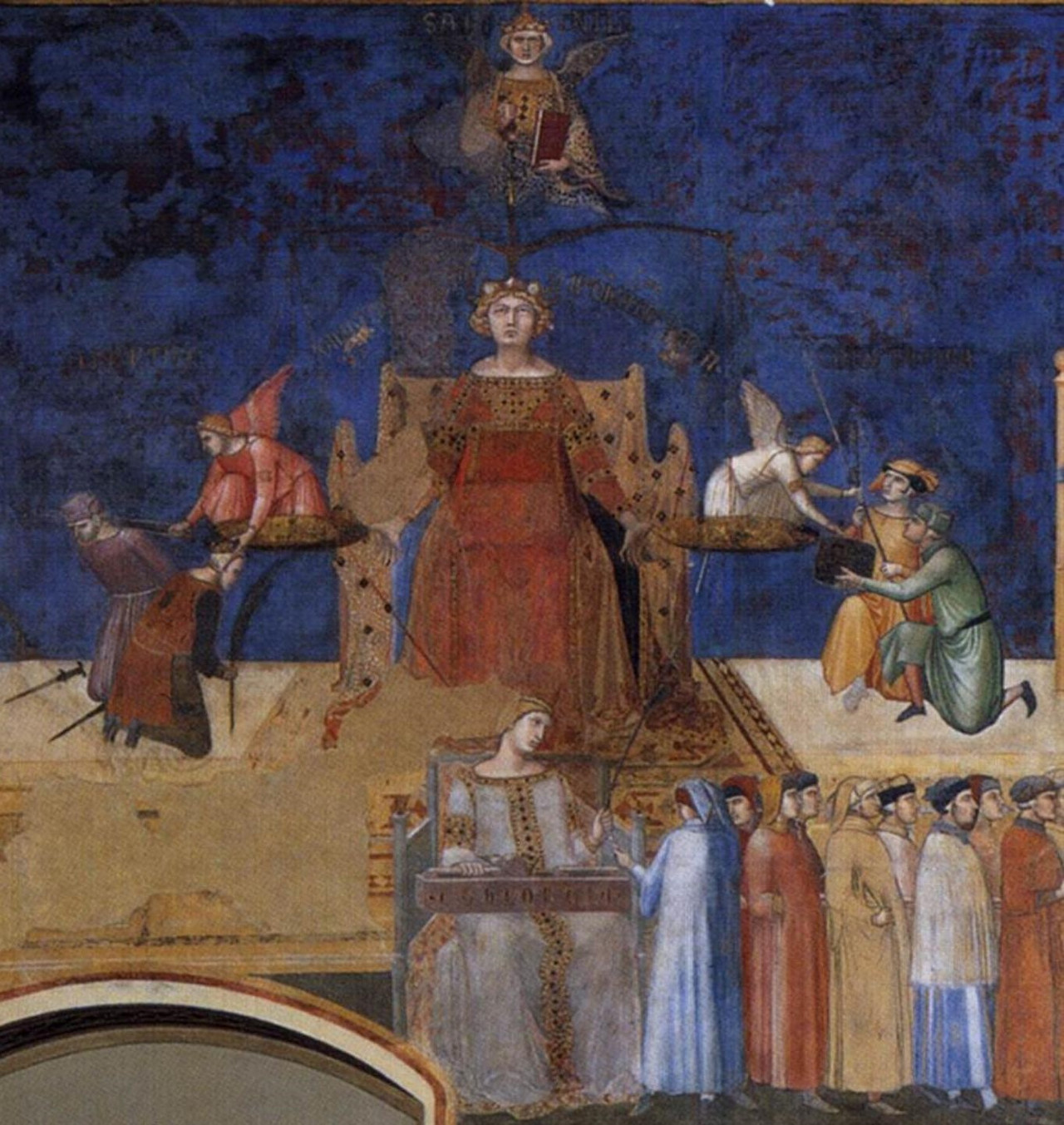 왼쪽 붉은 옷의 여인은 정의의 여신입니다. 로렌체티는 독창적인 도상학으로 그녀의 머리에 저울을 올렸습니다. 그녀는 양 쪽 저울 중 왼쪽엔 형벌로, 오른쪽엔 보상으로 정의를 분배합니다. 여신의 머리 위에 책을 든 지혜의 영(靈이 상과 벌의 균형을 맞추며 이를 판단하고 있습니다. 그녀 발치엔 덕(德)을 형상화한 흰옷의 여인이 저울로부터 이어진 긴 밧줄을 시에나 시민에게 전달하고 있습니다. 시민들을 따라가 봅시다.