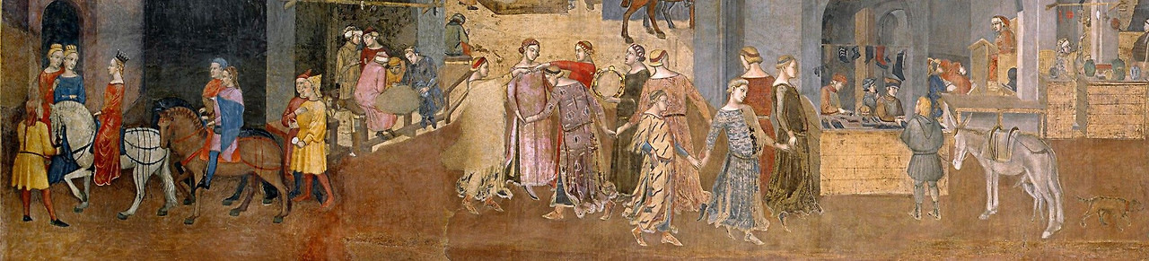 먼 곳에서 막 도착한 나그네는 신발가게에서 신발을 삽니다. 그 옆엔 작은 교실이 있습니다. 선생님은 근엄하지만 어디에나 있듯 벽 뒤, 졸고 있는 학생도 있을 것입니다. 단지를 앞에 둔 상인은 3년 뒤 분명 라틴어를 할 수 있겠지요. 서당 개 삼 년이면 풍월을 읊듯 시에나에서도 학교 옆 삼 년이면 라틴어를 배우지 않겠어요. 집중해 직물을 짜는 여인의 노동은 고되지 않고 바구니를 인 여인도, 짐을 잔뜩 실은 거리의 나귀들도 무거워 보이지 않습니다. 비계를 세운 건물에는 토목 공사가 한창이고 징수원은 오가는 산물을 기록하기 바쁩니다. 생동하는 활력과 부산한 움직임이 출렁거립니다. 시에나에 고정된 것, 정체된 것, 두려운 것은 없습니다.