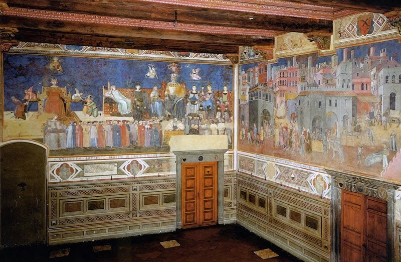 르네상스 시기의 자본주의 역시 지금과 마찬가지로 영리(營利)를 추구했습니다. 하지만 그 '영리 추구'안에는 '자본이 갖추어야 할 미덕'이 있었습니다. '근면', '절약', '정직', '공리', '정의' 같은 것이었지요. 결과뿐만 아니라 그 자본이 생성되는 과정에 대한 종교적 윤리가 들어있었습니다. 이들에게 존경할 만한 인격이란 능력 못지않게 '신용'과 '자비'가 할당된 넓고 깊은 그릇이었습니다. 시에나를 움직이는 9명의 위원들은 몽골제국과의 향신료, 비단 교역 등을 통해 부를 이룬 현대판 백만장자들이었습니다. 그들은 시에나를 '지상에 세운 임시 천국'으로 만들려 했습니다. 시청과 공공 기관, 교육시설, 대성당 등이 건립되었고 건립 기부금은 자신의 부와 권력을 정당화하는 또 다른 방법이었습니다. 그들이 이룬 부가 '애국적'이었다고 말할 수 있을지 모르겠습니다. 다만 로렌체티는 그 '부'가 '금권정치'나 '독재'로 흐르지 않도록 그림에 위대한 서사와 알레고리를 입혔습니다.