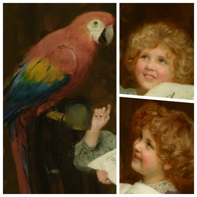 19세기 중반, 해가 지지 않는다는 영국의 부유한 중산층은 보수적인 가치를 존중했습니다. 명예로운 도덕을 갖춘 개인, 다정하고 자애로운 가정, 약자를 보호하고 질서를 지키는 사회를 지향했습니다. 그래서 어린아이와 애완동물이 있는 장르화가 대두되었고 인기를 끌었지요. 그러한 빅토리아 시대 최고의 화가, 아서 존 엘슬리(Arthur John Elsley, 1860~1952)는 한창 노래 배우기에 열중하고 있는 앵무새를 그렸습니다. <노래 레슨, 1909>입니다.