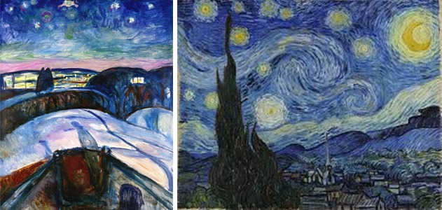 프랑스에서 레옹 보나의 아틀리에에 들어간 뭉크는 인상주의를 접하게 돼. 폴 고갱과 툴루즈 로트렉의 작품에 탄복하고 일본의 우키요에에 새로운 눈을 뜨게 되지. 오슬로에 있는 미술학교에서의 수업이 회화교육의 전부였던 뭉크는 자신에게 필요한 것이 무엇인지 알게 되었어. 또 무엇보다 반 고흐의 매력에 빠졌지. 뭉크와 반 고흐는 공통점이 많아. 우울증을 갖고 불안과 우울을 화제(畵題)로 다루었던 점도, 권총 사고가 있었던 것도, 인간 내면의 충동을 표현하려고 했던 표현주의적인 회화 의지도 공통분모라고 할 수 있지. 뭉크는 반 고흐에 대한 존경을 담아 1922년 <별이 빛나는 밤>이라는 작품을 완성해.