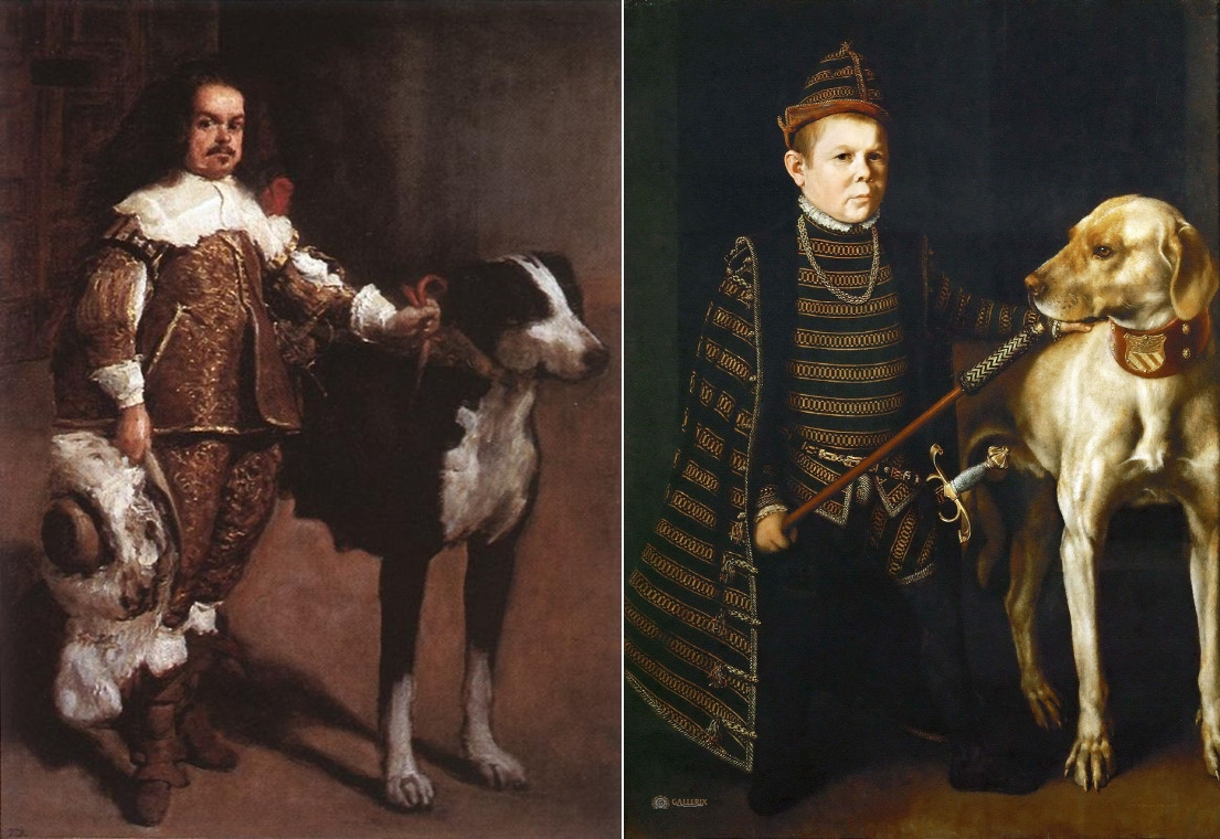 (왼) 벨라스케스 <개와 함께 있는 난쟁이, 1642) / (오) 안토니스 모르 <개와 함께 있는 그랑벨 주교의 난쟁이, 1560>