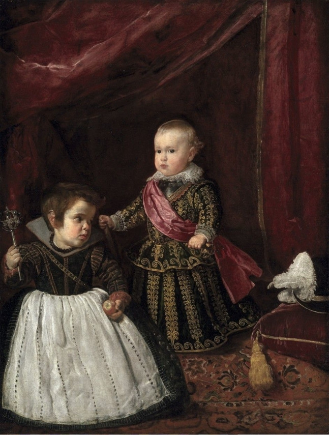 언뜻 보면 꼬마 둘이 어울려 노는 듯한 그림이야. 누가 주인공인지 알 수 없을 정도로 무게 중심이 고르지. 화면 중앙의 남자아이는 에스파냐 펠리페 4세 왕의 아들, 발타자르 카를로스 왕자야. 이제 두 살이지. 금실로 고급스럽게 수놓은 의례용 드레스 위에 광택 나는 어깨띠를 두르고 왕위 후계자답게 지휘봉을 들고 있구나.