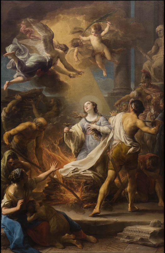 루치아 성녀의 순교는 1759년에 완성된 세로 3미터, 가로 2미터의 커다란 작품이다. 로코코 영향으로 성녀 루치아는 끔찍한 죽음을 앞두고도 방금 화장을 하고 나온 여인처럼 아름답게 보인다. 또한 주인공인 루치아를 화면 중앙에 두고 스포트라이트를 비춘 반면, 나머지 인물들은 주변부에 어둡게 처리한 것에서는 신고전주의 화풍을 느낄 수 있다. 성녀 루치아는 자신의 발 밑에 타들어가는 불길과 이미 가녀린 목을 뚫은 듯한 칼에는 아랑곳하지 않고 순교의 종려나무를 들고 날아오는 천사를 평온하게 바라보고 있다. 루치아의 오른 쪽 위에는 제우스 동상이 번개를 손에 쥔 모습으로 앉아있다. 이 그림에서 제우스는 이교도의 신을 상징한다. 우리는 그리스로마 신화를 종교적인 관점이 아니라 재미있는 옛날 이야기로 받아들이는 것에 익숙하다. 따라서 만화속에서 자주 보던 제우스나 포세이돈이 유일신 야훼에 대비되는 이교도의 신이라고 상상하기 힘들다. 유럽 종교화, 특히 순교의 이야기에서 그리스로마 신을 발견하게 되면 그건 순교자들이 이교도에 대한 숭배를 거부하고그리스도교 신앙을 지키다가 죽어갔다는 것을 상징하는 것이라 해석하면 된다.