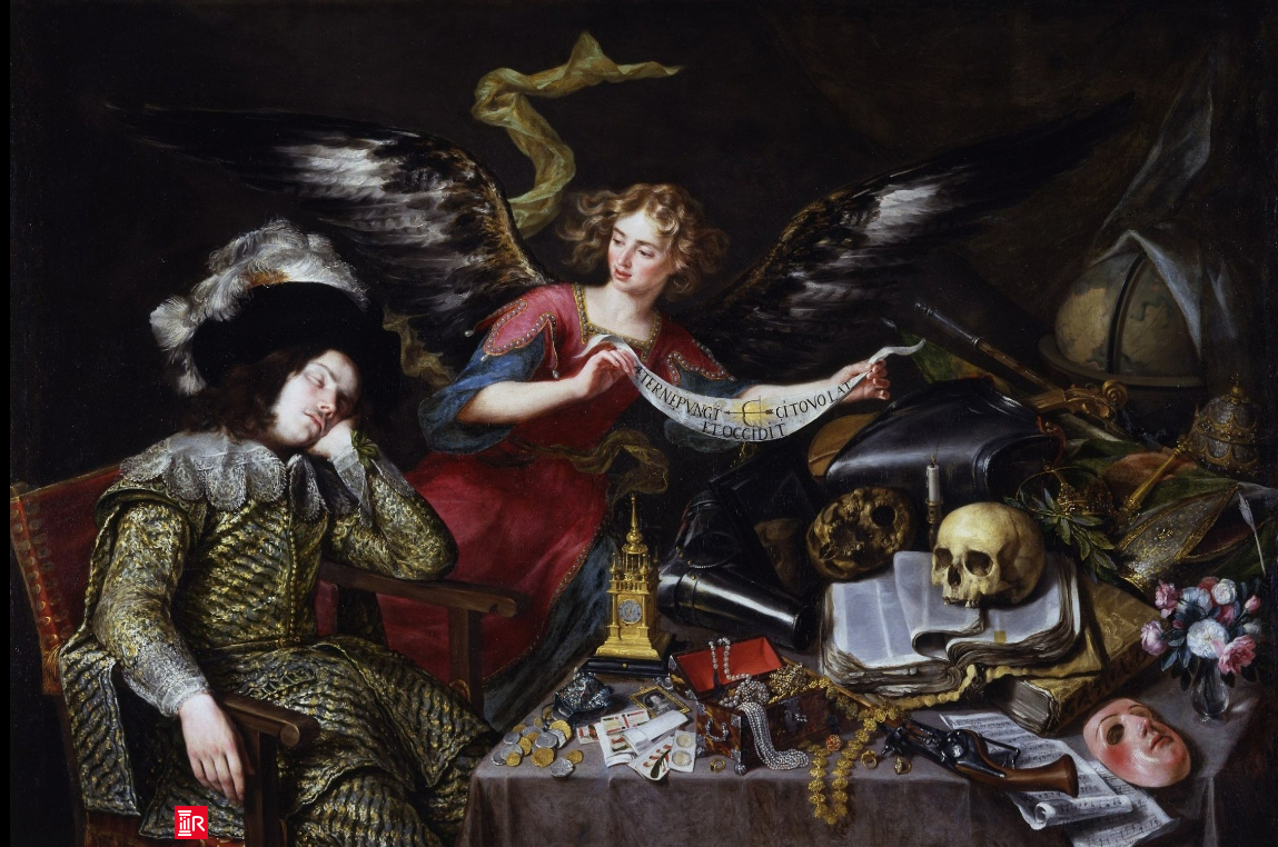 책 위의 해골과 꺼진 촛불은 사람의 생명이 유한하다는 것을 나타내고 시계는 인생이 짧다는 것을 의미한다. 천사가 들고 있는 현수막(?) 중간에는 태양 위에 화살이 그려져 있다. 이는 시간과 죽음을 암시한다. 시간은 - 한국어 표현 그대로 - 쏜살 같이 날아가고 우리를 죽음에 이르게 한다는 것이다. 천사는 잠 든 귀족에게 찾아와 지상의 모든 것이 덧없음을 알려주려는 것이니 그렇다면 귀족이 꾸고 있는 꿈은 구운몽 같은 일장춘몽 일 것이다.