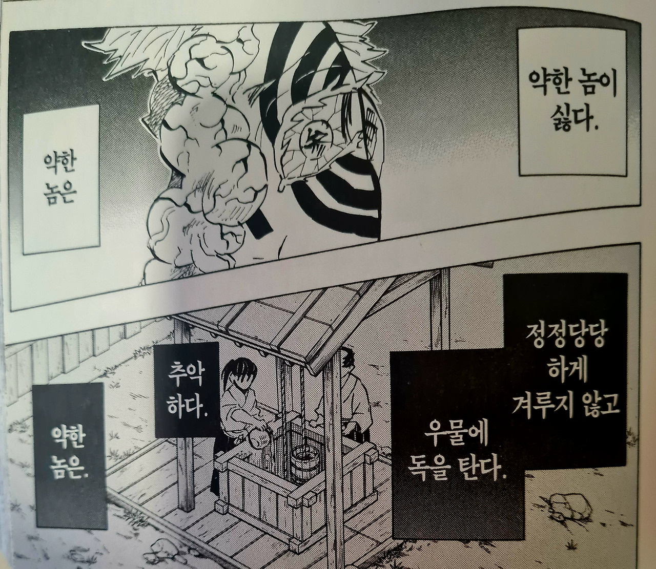 그런데. 귀멸의 칼날을 보고 있는 동안에는 그 문장에 고개를 끄덕이게 된다. 하현 5 루이가 엄마, 아빠의 품에 안겨 죽어갈 때, 상현 6 다키와 규타로가 남매의 인연을 되새길 때, 우리는 '너희들의 죄는 사악하지만 인간적으로는 애처롭구나'라고 생각하게 된다. 죄와 사람을 분리하든 죄와 사람을 함께 고려하든. 어쨌든 '죄'와 '사람'이라는 두 가지 요소를 동시에 떠올리게 되는 것이다.