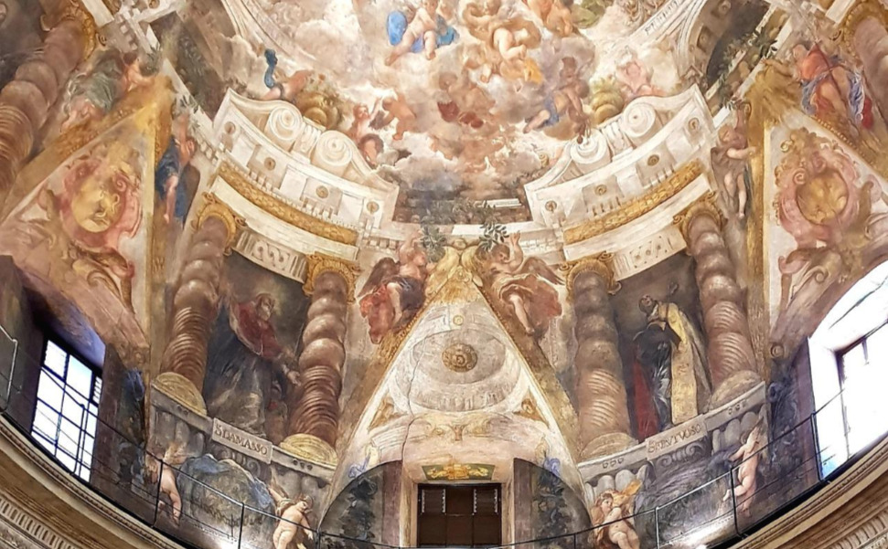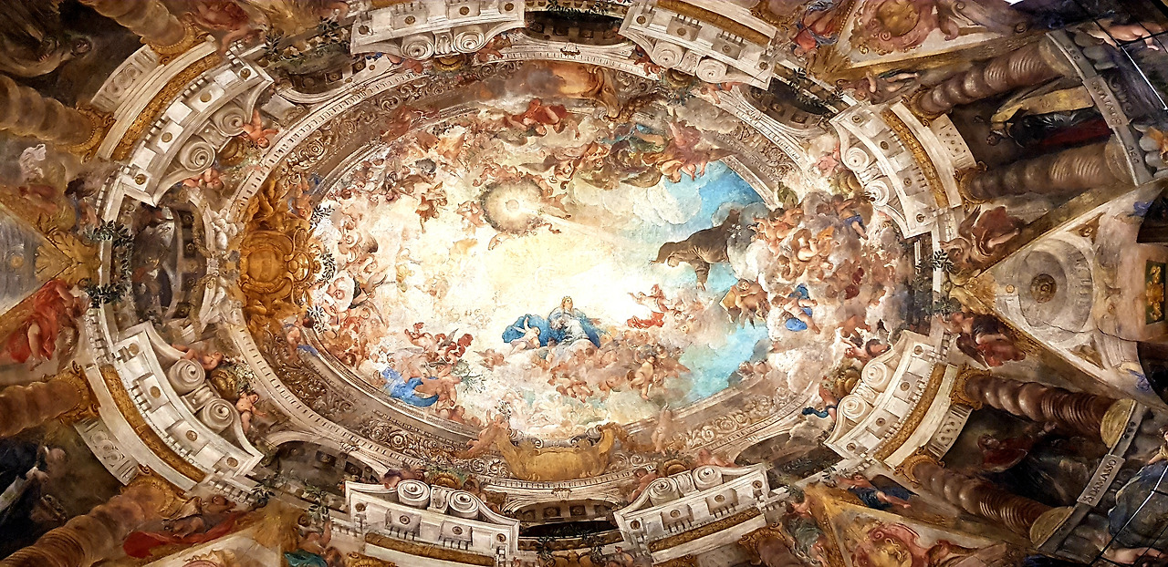 여담으로 한 가지 얘기하면 르네상스 이후 화가와 조각가 사이에는 소위 기싸움이 있었다. 회화와 조각 중 어느 예술이 더 위대하느냐는 것이다. 조각이 회화보다 위대하다고 얘기할 수 있는 것은 역시 입체성이었다. 화가는 조각가가 자랑하는 입체감은 화가도 해 낼 수 있다고 응수했다. *그리자이유’나 트롱프뢰유 같은 것들이 평면에 재현해 낸 입체감의 예이다. 이 성당에 그림을 채운 화가들이 조각가를 의식했는지는 모르겠지만 입체감을 표현하는 자신의 기술에 높은 자부심을 가지고 있었을 것이다.