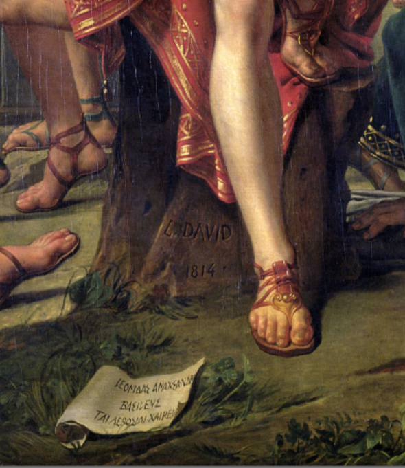 마지막으로 레오니다스 왕 발 밑에는 작가 이름과 그림을 완성시킨 년도가 새겨져 있고 그 밑의 종이쪽지에는 작품의 제목인 “테르모필라이의 레오니다스”라고 쓰여있다.
