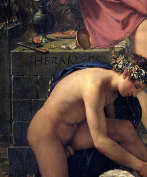 그 이상의 이야기도 있으나 너무 선정적인 애기가 될 것 같아 이만 생략하고 싶지만... 이 그림을 설명하기 위해 한 가지 더 애기해야 할 것 같다. 스파르타인들은 헬로트인들에게 술을 먹여 취하게 만든 다음 광장에 끌고 나가 주사로 인해 벌어지는 추태를 아이들에게 보여주었다고 한다. 한 마디로 술을 멀리하라는 교훈을 이런 야만적인 방식으로 보여준 것인데 이건 앞서 애기한 육체적 폭력 이상의 끔찍한 학대이다. 여기까지 얘기하면 이 그림이 무엇을 말하는 것인지 알 수 있을 것이다. 오른쪽의 아이는 옛된 외모에 어울리지 않게 창을 쥐고 벌거벗은 채 서 있다. 스파르타의 군사교육은 일곱살 때부터 시작되었고 옷도 제대로 주지 않았다고 하니 역사기록을 제대로 묘사하고 있는 것이다.