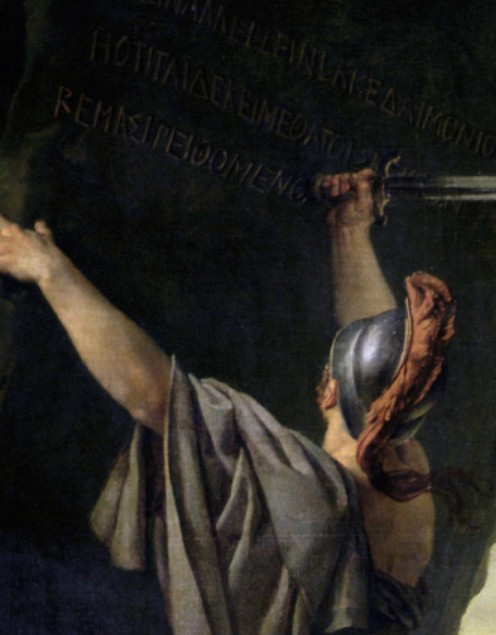 한 가지 더 살펴보자. 좌측 상단에는 아까 애기 한대로 한 병사가 비장한 시구를 새기고 있고 우측 상단에는 피난을 가는 한 무리의 인물들이 있다. 좌측의 병사는 죽음을 목전에 두고 있지만 불멸의 명예를 얻을 것이고 우측의 피난민은 목숨을 건지겠지만 쉽게 잊힐 것이다. 물론 우리에게는 목숨을 소중히 여기는 피난민의 태도를 잘 못 되었다고 비난할 권리도 없고 생명보다 명성이 더 중요하다는 것도 아니다. 이 기회를 빌어 덧붙이자면 본인은 결코 전쟁을 미화하거나 스파르타의 군국주의를 찬양하고자 하는 것이 아니다. 미술작품에 들어있는 메시지를 역사에 비춰 설명하고자 할 따름이니 오해 없으시기를.