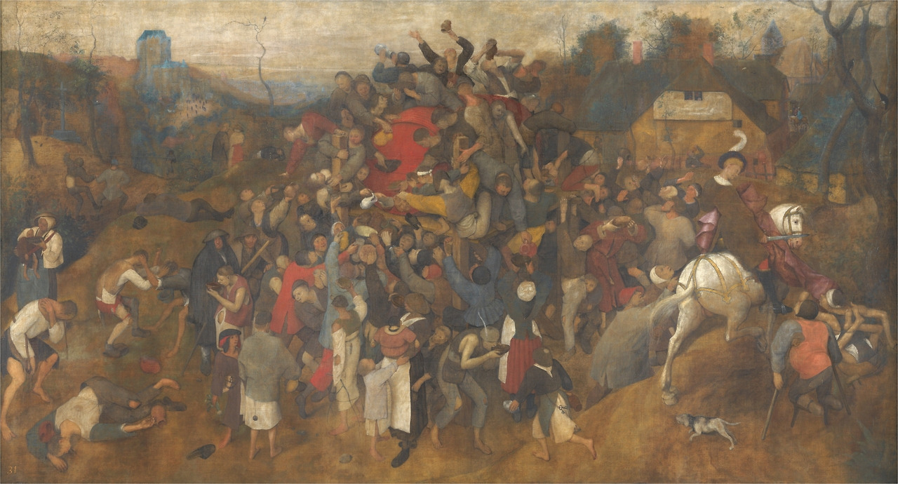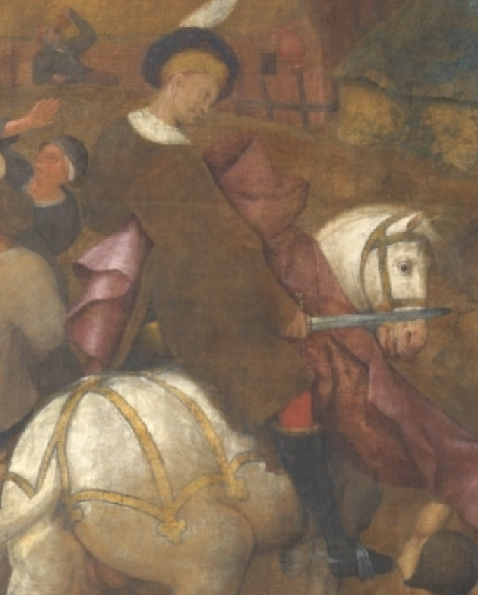 마을 사람 모두가 원숭이를 넘어 사자가 된 것 같다. 이쯤 되면 슬슬 사람이 술을 마시는 것이 아니라 술이 사람을 마시기 시작한다. 그림의 배경이 되는 ‘산 마르틴 축제’는 11월 11일이다. (빼빼로 데이라 외우기 쉽다.) 이 즈음에는 보통 그 해의 첫 와인이 생산되는 시기이다. 어느 축제이든 술이 빠질 수 없는 법이지만 산 마르틴 축제는 더더욱 포도주와 떼려야 뗄 수 없는 관계인 것이다. 참고로 산 마르틴은 천주교 초기의 성인으로 로마 장군 시절 헐벗은 걸인에게 옷을 잘라 건네준 일화로 유명하다. 그림 우측 하단, 백마에 올라탄 귀족 차림의 인물이 바로 산 마르틴이다. 한 손에는 걸인에게 옷을 잘라줬을 때 사용했던 검을 쥐고 있다. 거대한 와인 통과 산 마르틴의 모습에서 이 그림이 산 마르틴 축제를 묘사했다는 것을 추측할 수 있다.