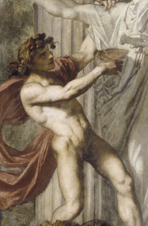 이 정도만 되어도 다행인데 안타깝게도 마지막 돼지의 단계에 접어든 사람도 있다. 화폭 뒷부분에는 넋 나간 사람처럼 화관을 들고 춤을 추는 여인이 있다. 화들짝 놀란 두 여인이 그녀를 끌어내리려 하고 있는 모습도 보인다. 화면 우측을 보면 한 젊은이가 조각상에게 술잔을 권하고 있다. 망토가 휘날리고 있는 것을 보니 왼 손으로 조각상의 어깨를 부여잡고서는 좌우로 몸을 흔들고 있는 모양이다. “그렇게 뻣뻣하게 굴지 말고 한 잔 하라니까.” 젊은이의 혀 꼬인 음성이 상상된다.