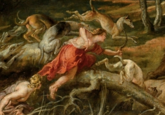 그림 속 여신의 모습이 워낙 아름다워 앞서 보았던 루벤스 그림 속 여전사들 같은 박력을 발견할 수 없을지도 모른다. 하지만 조금만 더 상상력을 동원해보면 사냥의 여신다운 포스를 느낄 수 있다. 앞서 말했듯이 그림 속 날씨는 폭풍우 직전이다. 아마 낮은 천둥소리도 이미 들려오고 있을 것이다. 대부분의 사람들이 실내로 피신하고 있을 텐데 여신은 거꾸로 들판으로 나오고 있지 않은가. 한 손에는 활을 들고 한 손으로는 사냥의 시작을 알리는 고동을 불며 사냥개와 몰이꾼들을 불러 모으고 있다. “역시 사냥은 폭풍우 속에서 해야 제 맛이지. 오랜만에 비바람 뚫고 화살 좀 날려볼까” 여신의 호연지기 앞에 가슴이 뻥 뚫리는 것 같다.