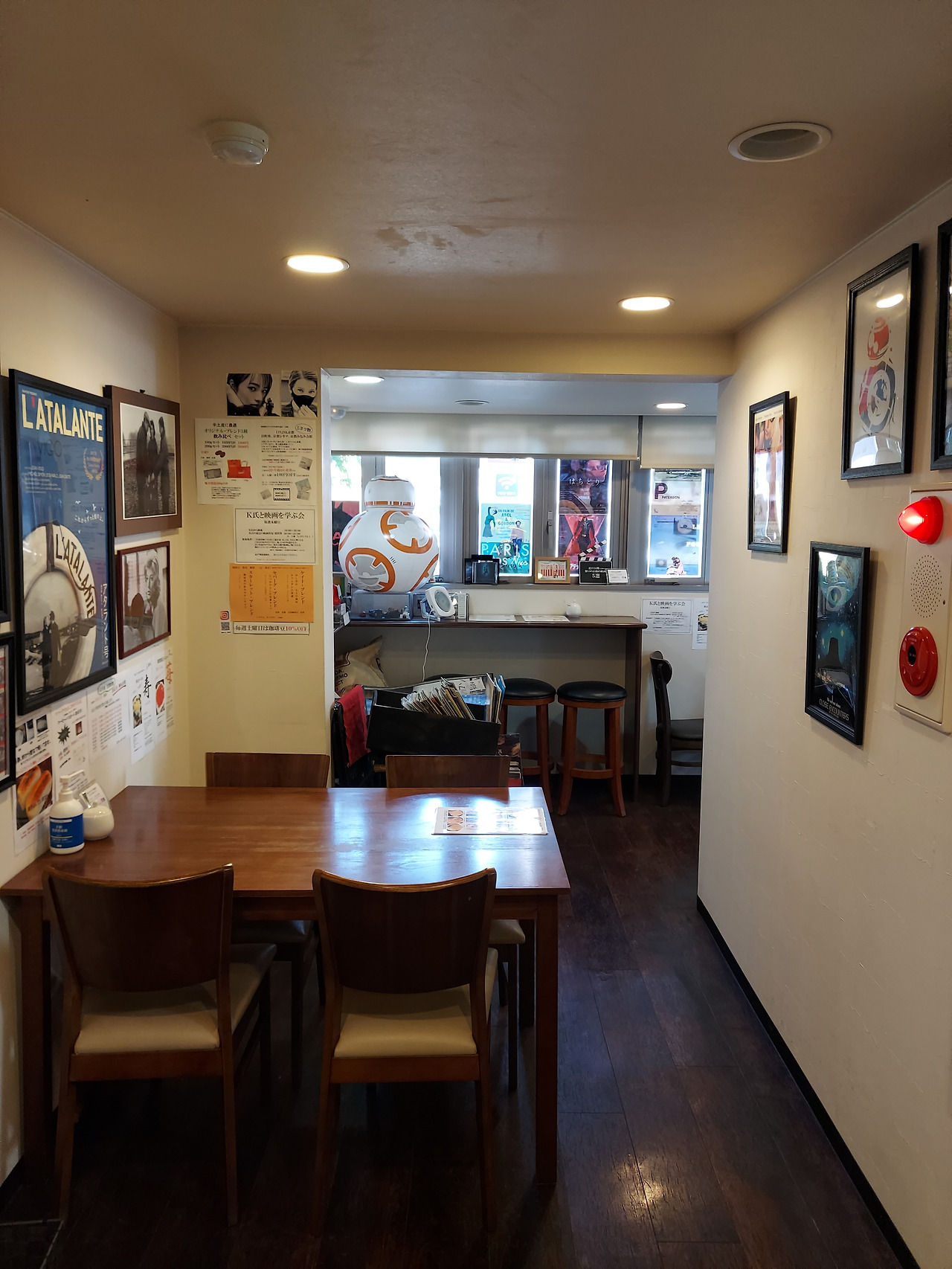 카페는 조용한 주택가 속에 자리 잡고 있었다. 문을 열고 들어서자 나이 지긋하신 할아버지께서 맞이해 주셨다. 카페 안을 둘러보니 주인 할아버지께서 영화 마니아라는 것을 단박에 알 수 있었다. 실물 크기의 BB8 로봇이 – 스타워즈 시퀄 3부작에 등장한다. - 선반 위에 올라가 있었고 가게 내의 벽에는 영화 포스터들이 가득했다. 내부 인테리어는 영화 포스터를 제외하면 특별한 것이 없었다. 교토 카페라고 하면 기대하게 되는 앤티크 한 분위기와는 거리가 멀었다. 하지만 이 장소가 무척이나 마음에 들었다.