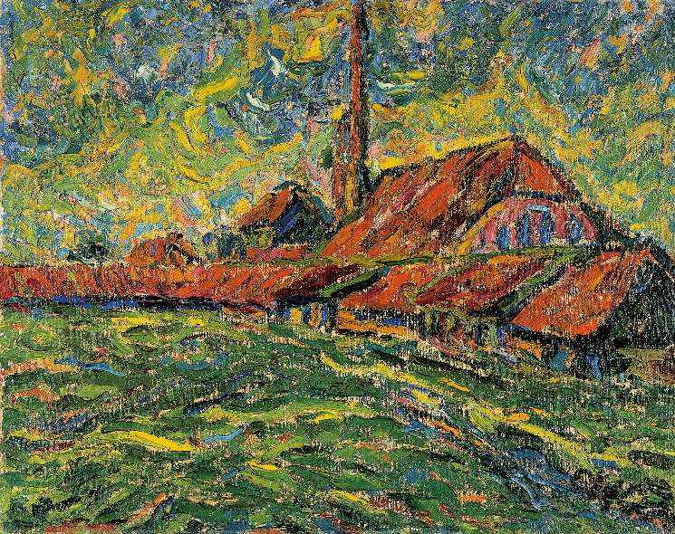 색체는 어릴 때 학교에서 받아본 적 있는 ‘색맹’ 검사지를 보는 것 마냥 여러 색이 강하게 뒤엉켜 있다. 음악으로 치면 화음과 불협화음의 중간쯤 되는 듯하다. 조화를 이루는 것도 아니지만 그렇다고 형체를 못 알아볼 정도로 불화하지도 않는다. 이렇게 색이 뒤엉켜 있는 가운데도 건물을 이루고 있는 붉은색은 확실히 눈에 띤다. 헤켈은 이 그림은 교외의 벽돌공장을 그린 것이다. 헤켈은 이 풍경에 매료되어 비슷한 주제로 여러 그림을 그렸는데 티센 미술관의 작품은 그중 첫 번째 그림이다. 극한의 임파스토 기법과 거침없는 색체가 관람객을 사로잡는다.