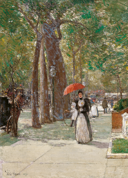 마드리드에서 근무하는 덕에 티센 미술관을 여러 번 방문할 수 있었는데 방문할 때마다 컬렉션 전체를 볼 수는 없으니 그 날의 기분 따라 특정 유파 혹은 특정 시대에 집중하여 감상하는 경우가 많았다. 하지만 방문할 때마다 빼놓지 않고 찾게 되는 그림이 하나 있으니 바로 차일드 하샘(Childe Hassam)의‘뉴욕, 워싱턴 스퀘어의 5번가’라는 그림이다. 싱그러운 가로수를 따라 한 여인이 외출을 하는 모습을 잡아낸 이 그림은 언제 보아도 미소를 짓게 된다. 우울할 때 이 그림을 보면 잠시라도 마음이 환해지고 기분이 좋을 때 보면 날아갈 듯 가슴이 부풀어 오른다.