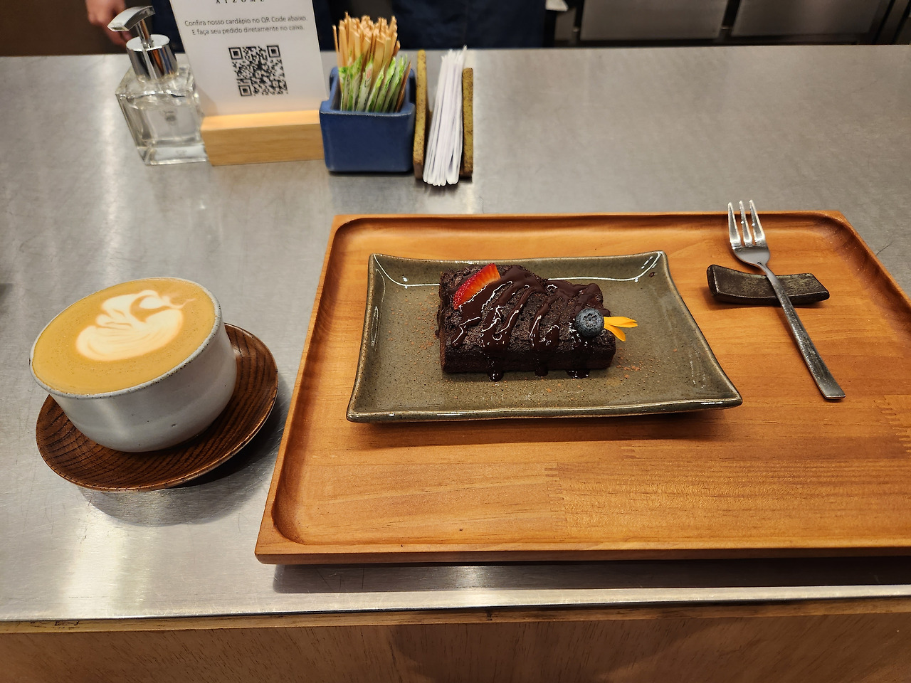 전시를 둘러본 후 바리스타 앞에 앉았다. 플랫 화이트 한 잔과 브라우니 하나를 주문했다. 잠시 후 받아 본 커피와 디저트 케이크는 일본 전통 찻집의 맛차와 화과자(일본 전통과자)를 떠올리게 했다. 커피나 차에 달콤한 간식을 곁들이는 것은 세계 어디를 가나 보편적인 메뉴인데 특별히 맛차와 화과자를 떠올린 이유는 뭘까. 일단 이 카페가 일본 문화원 내에 있기 때문이기도 하겠지만 더 큰 이유는 찻잔에 있었다. 손잡이가 없고 민무늬에다가 푸른빛을 띠고 있는 찻잔. 이 찻잔은 일본식 다완인 것이다. 유럽인이 즐기던 음료를 동양식 그릇에 담아낸 미묘한 조화가 신선한 자극으로 다가왔다.