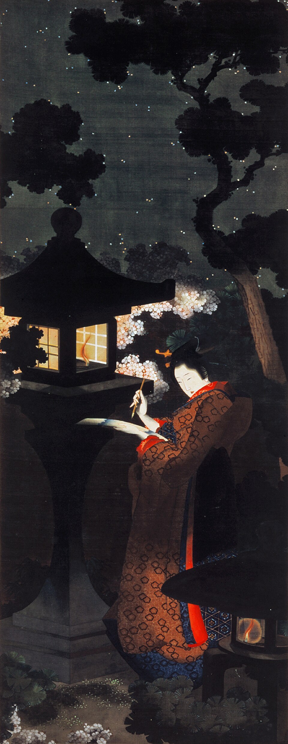 그림의 첫인상은 빛과 어둠의 강렬한 대비이다. 17세기 유럽에서 유행하였던 '키아로스쿠로'가 떠오른다. 카츠시카 오이는 밤풍경에 스며든 빛을 그리는 데 능숙했다. 그러다 보니 많은 미술학자들이 그녀의 그림을 램브란트나 라투르의 작품과 비교해 왔다. 석등의 빛은 따뜻한 노란색 계열이고 석등의 빛을 받은 벚꽃은 새하얗다. 여성의 얼굴 역시 일본 미인화의 전통대로 순백에 가깝다. 발치에 있는 낮은 석등과 치맛자락에 비친 불빛은 운치 있다. 까만 밤하늘에는 별빛이 점점이 박혀있고 소나무는 밤하늘보다 더 짙은 어둠에 잠겨 있다.