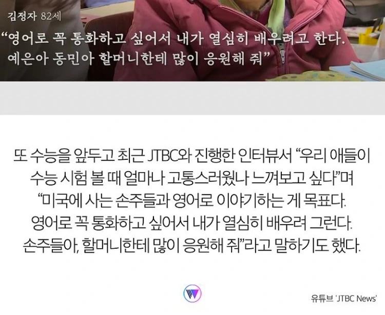 할머니의 수능. 굽은 등으로 수능 시험장에 들어서는 할머니의 사진을 보았다. 늦깍이 학생을 처음 보는 것도 아닌데, 저 굽은 등으로 책상에 앉아 공부를 하고, 심지어 대한민국 공부의 끝판왕인 수능까지 보신단다. 그리고 인터뷰에선 손자들과 영어로 통화하고 싶어 열심히 하시단다. 눈물이 났다. 나는 슬펐던건가? 꼭 그렇지만도 않은데, 감동의 눈물이었나?