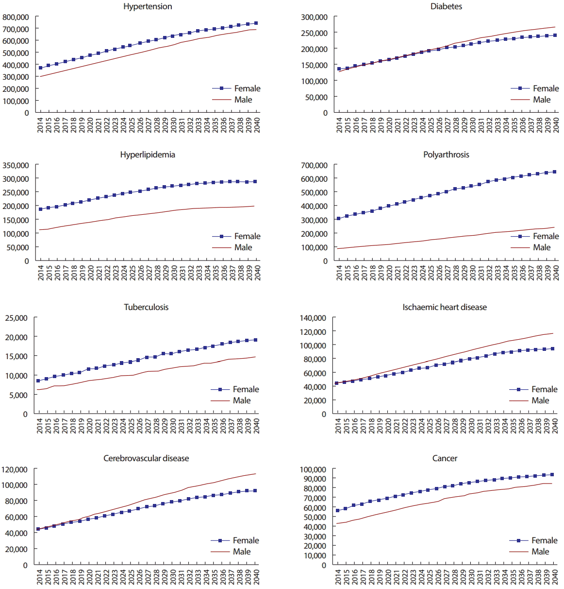여성의 경우 1위가 근육골격계통 및 결합조직의 질환이다. 2위는 신생물, 3위는 소화기 질환, 4위는 비뇨생식기 질환, 5위는 순환기 질환이다.