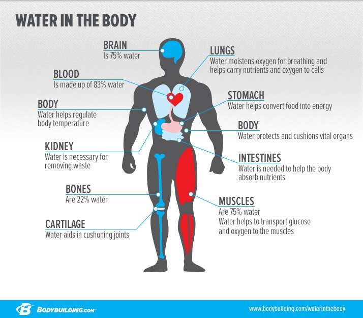 우리 몸의 중요한 '장기'는 모두 물을 필요로 한다. 뇌, 폐, 심장, 간, 신장은 많은 양의 물로 구성이 된다. 장기에 따라서 65%~85%가 물로 구성된다. 심지어는 뼈도 22%는 물이다.