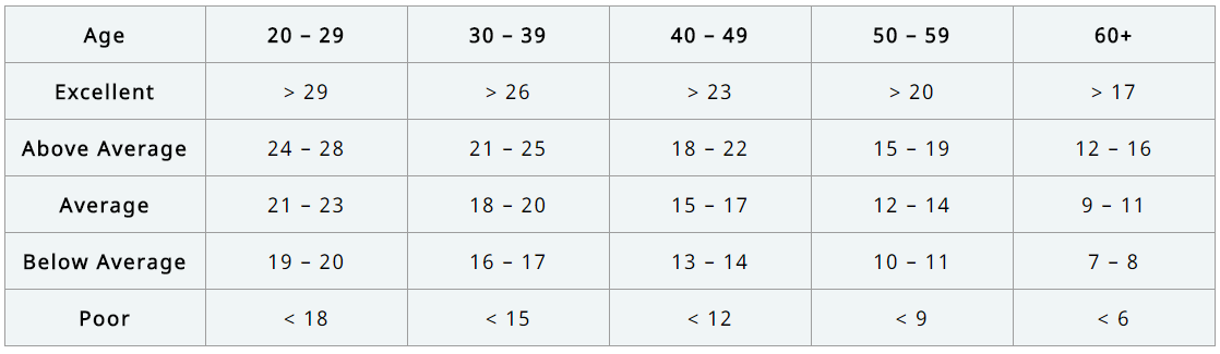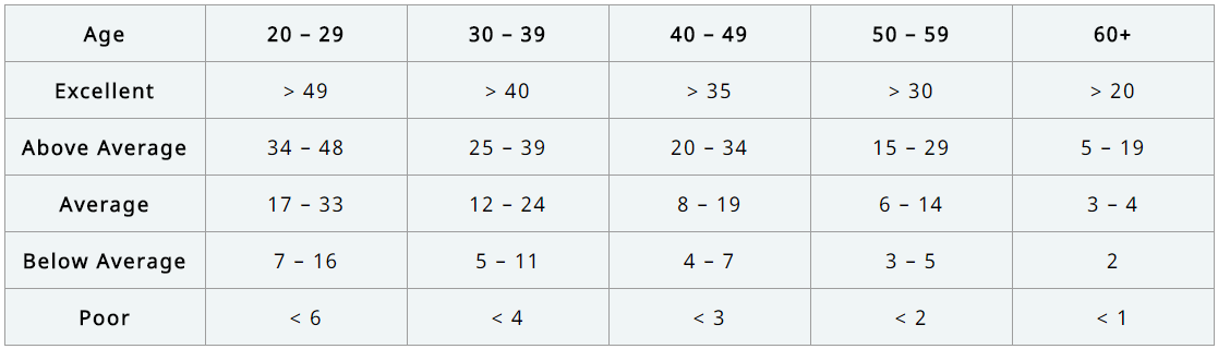 우선 '상체 체력'을 알아보자. 1분간 무릎을 꿇고 하는 푸시업으로 측정한다. 지표는 아래와 같다.