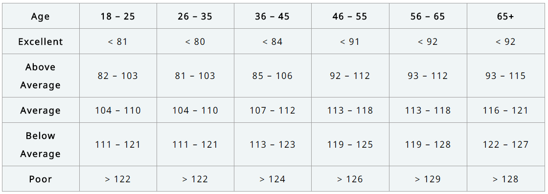 맥막이 낮게 유지된다는 것은 호기성 지구력이 좋다는 의미다. 나는 3분간의 테스트 후 96회/min으로 '평균 이상'에 해당한다. 하면서 힘들다고 생각 안 했는데 맥박이 빨리 뛰어서 놀랐다.