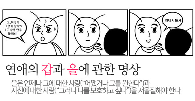 관계를 유지시켜 주는 것은 '공급'과 '수요'의 불일치가 가져다주는 '긴장감'이다. '애정의 경제 시스템'이 붕괴할 수도 있다는 긴장감. 이 긴장감이 공급과 수요의 균형을 맞춰준다. 이런 걸 잘하지 못하고 자신의 한계만큼 수요하고 공급하는 사람을 우리는 '호구'라고 부른다. 이들은 사랑 빈민이 되어 연애 슬럼가에 살다 비운의 삶을...