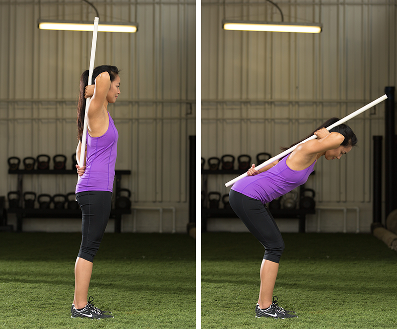 그래서 올바르게 서 있다가 엉덩이가 먼저 출발하는 것이다. 등은 엉덩이가 뒤로 빠지는 만큼 각도가 생기게 된다. 머리의 위치는 어깨로부터 먼 처음과 같다. 가슴은 펴있어야 한다. 배는 평평하게 힘을 주고 있어야 한다.