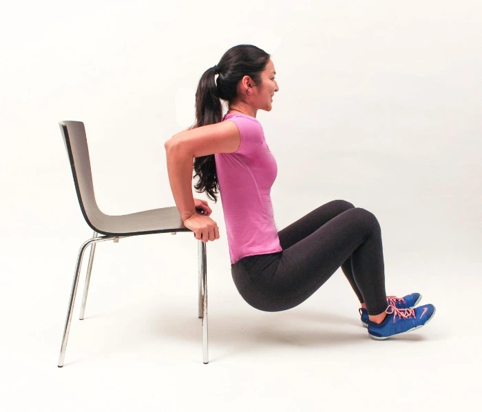 체어 딥스는 보통의 딥스보다 하기가 수월하다. 발을 바닥에 대고 있기 때문이다. 원하는 만큼 체중의 일부를 발이 지탱해 줄 수 있다.
