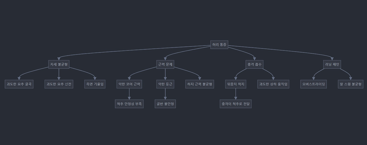 러닝 시 허리 통증의 원인은 크게 네 가지다. 그중 폼과 연관이 있는 것은 자세 불균형, 충격 흡수, 러닝 패턴이다. 허리 통증이 폼과 상당히 연관이 많다.